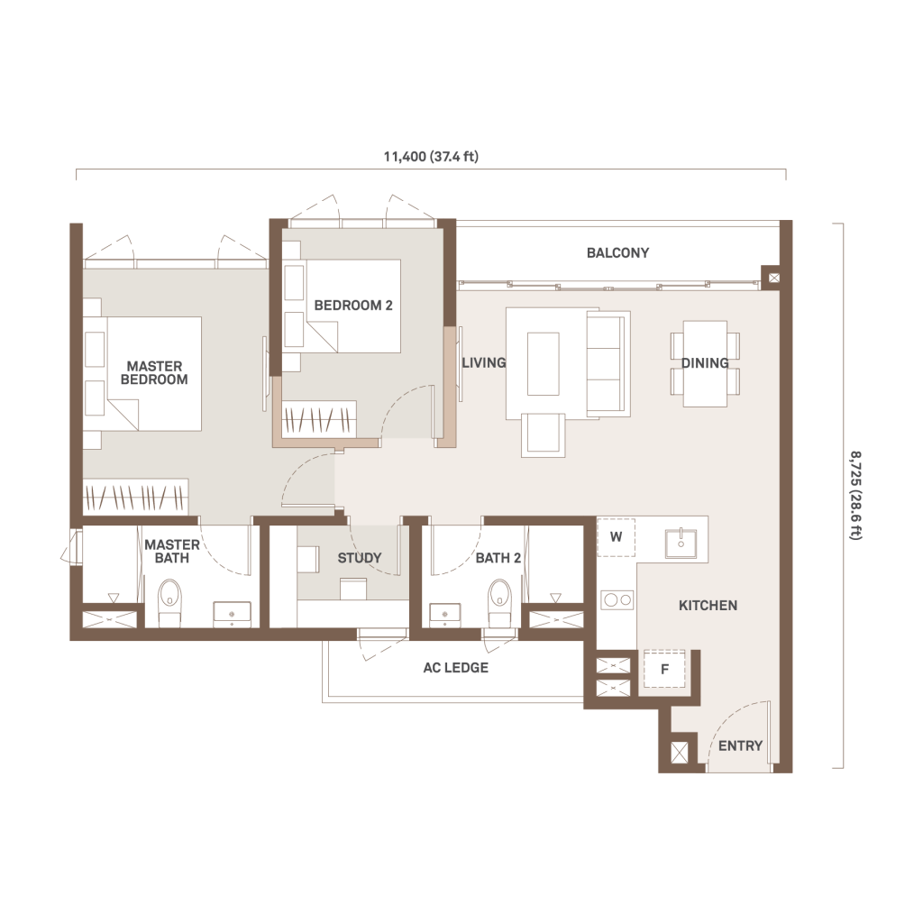 889 sqft | 2 Rooms | 1 Study | 2 Bathrooms | 1 Balcony