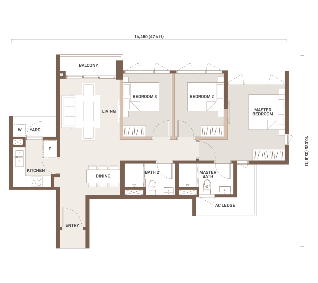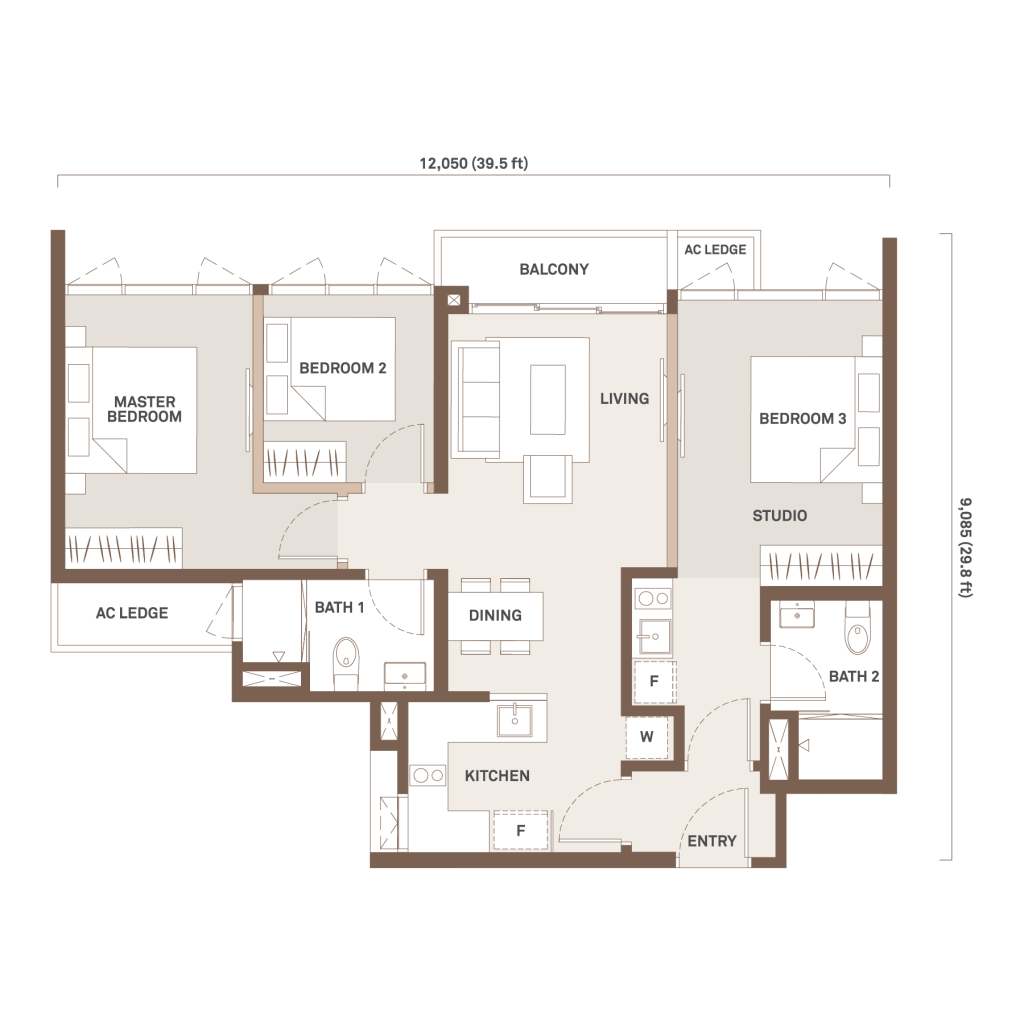 1,069 sqft | 3 Rooms | 1 Study | 2 Bathrooms | 1 Balcony | 1 Yard