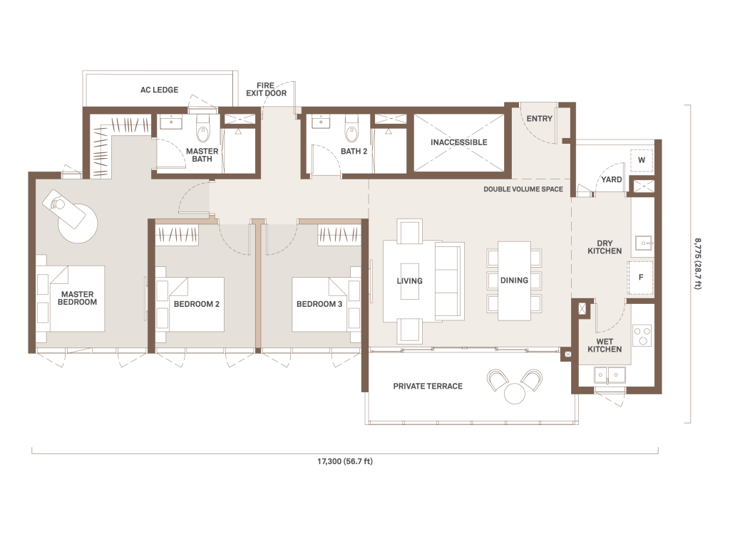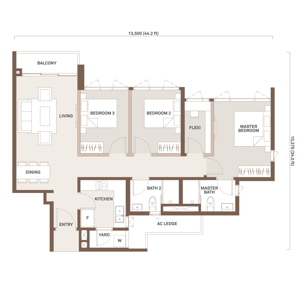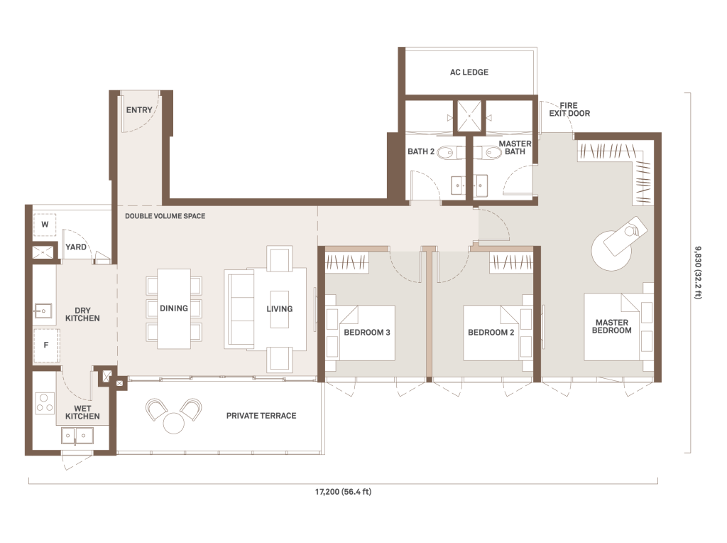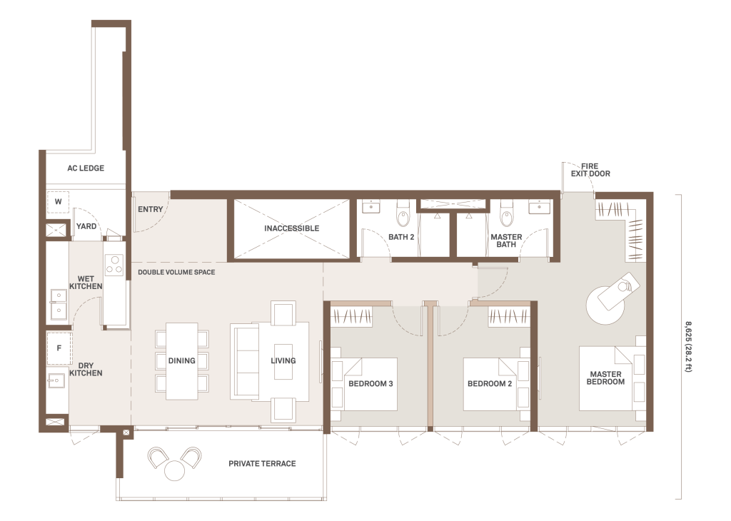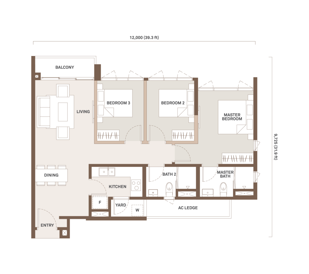952 sqft | 3 Rooms | 2 Bathrooms | 1 Balcony