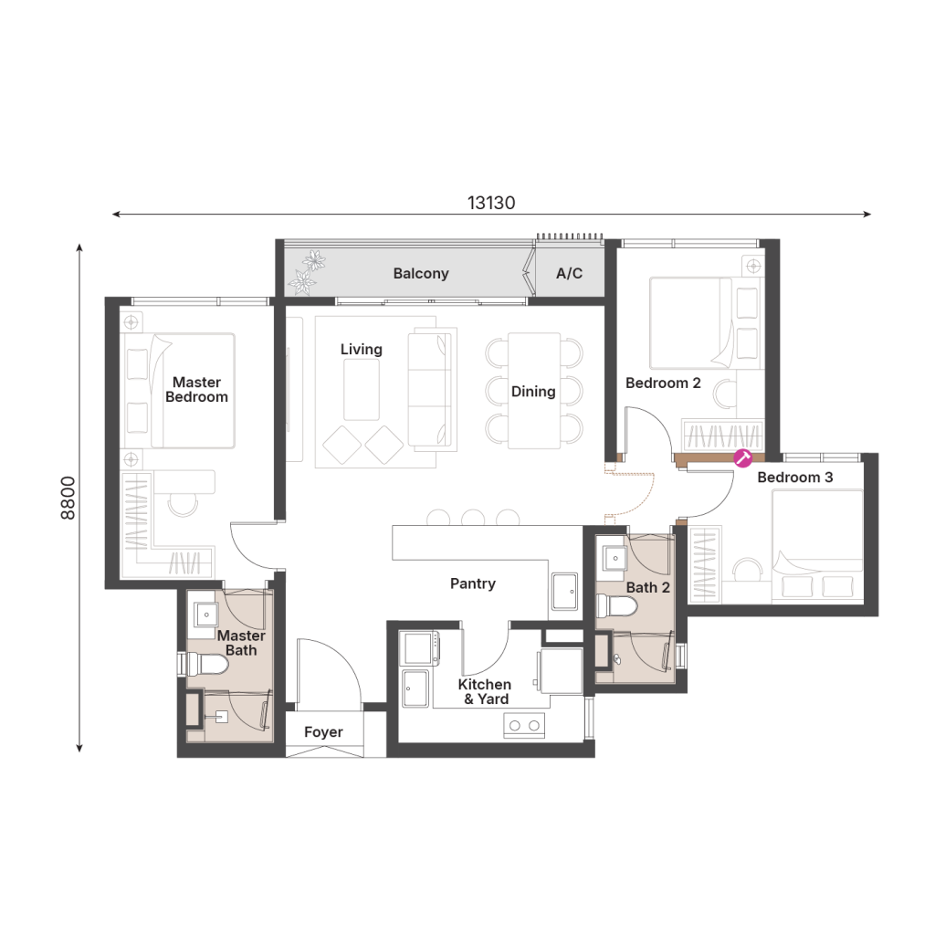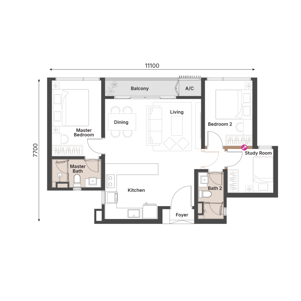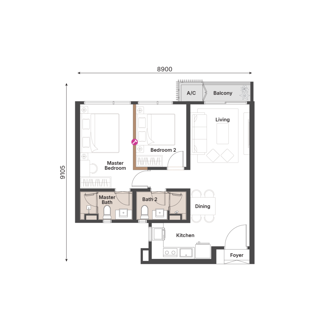 732 sqft | 2 Rooms | 2 Bathrooms
