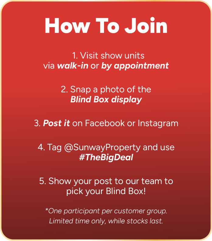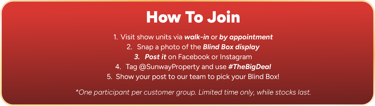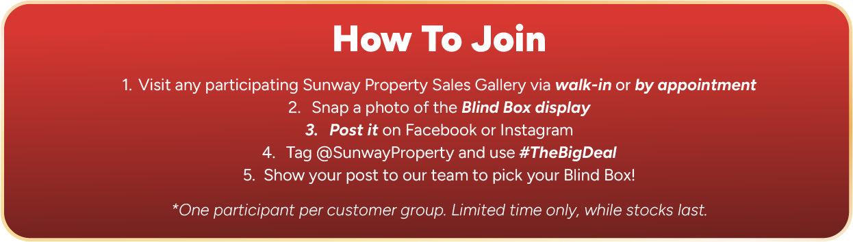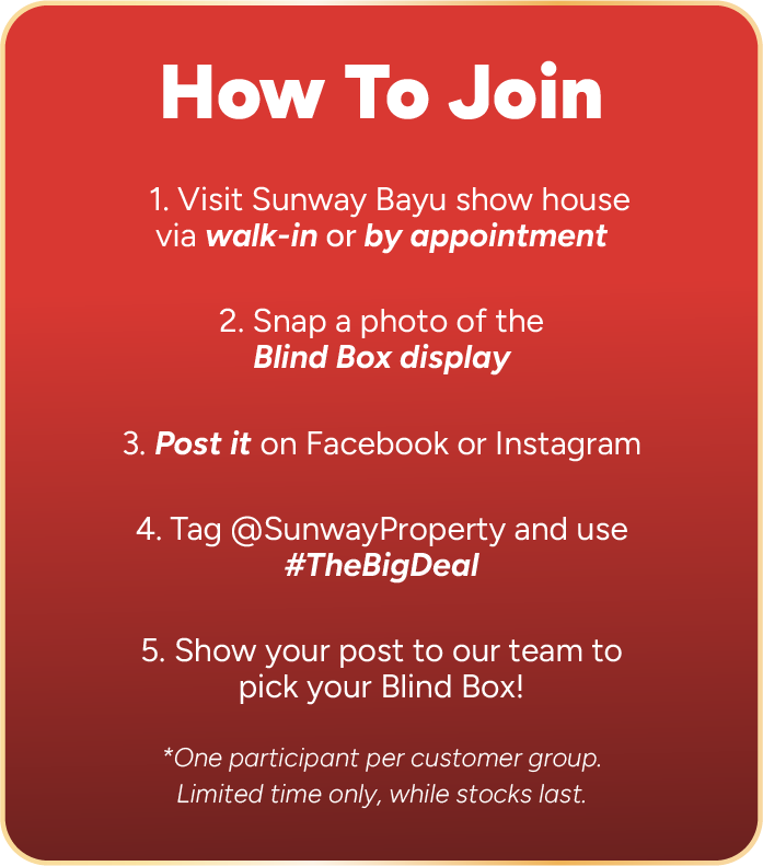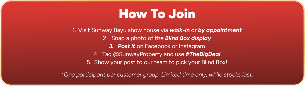 - One (1) blind box for 1 participant per customer group at Sunway Bayu show house.